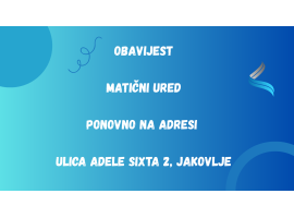 Obavještavaju se mještani Općine Jakovlje i stranke da se Matični ured u Jakovlju od 12. lipnja 2025. godine (četvrtak) ponovno nalazi na svojoj stalnoj lokaciji u zgradi Općine Jakovlje, Jakovlje, Ulica Adele Sixta 2, nakon...