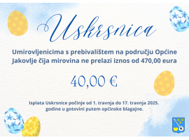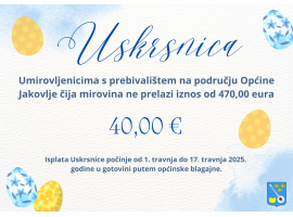 Općinsko vijeće Općine Jakovlje na 28. sjednici donijelo je Odluku o isplati jednokratne prigodne pomoći - Uskrsnice iz Proračuna Općine Jakovlje za 2025. godinu umirovljenicima s prebivalištem na području Općine...