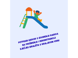 Nakon provedenog postupka nabave, potpisan je Ugovor o izvođenju radova na proširenju i rekonstrukciji dječjeg igrališta u Kraljevom Vrhu Predmet ovog projekta je rekonstrukcija i proširenje dječjeg igrališta u...